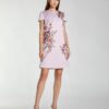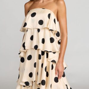 Beige trägerloses gepunktetes Charmeuse-Kleid mit Rüschen