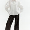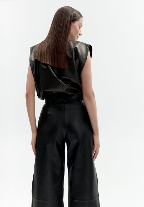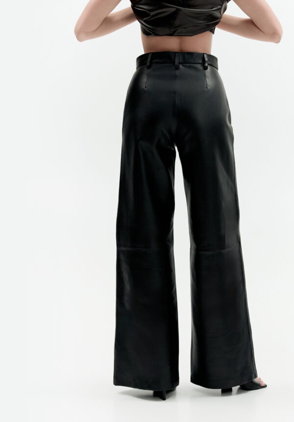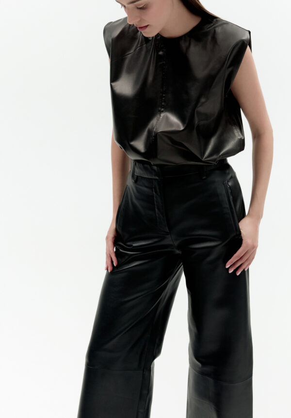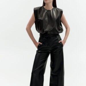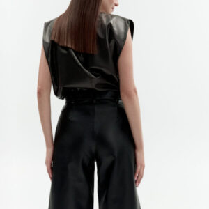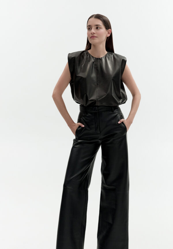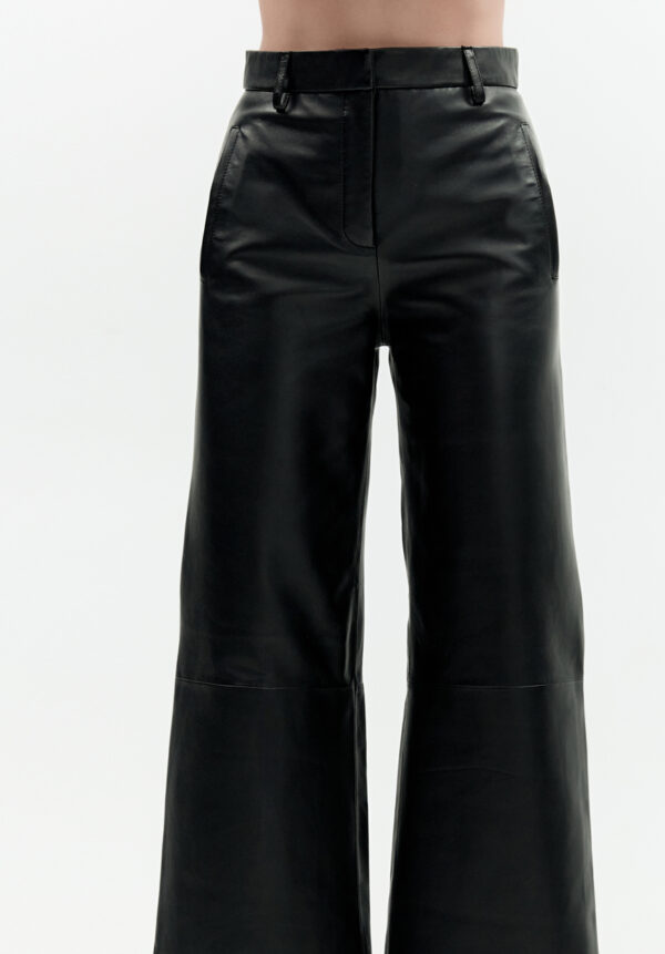 Die schwarze Hose „Nissa“ von ENES ANTWERP aus naturbelassenem Lammleder verkörpert zeitlose Eleganz mit einem modernen Touch. Der hohe Bund betont die Taille perfekt, während das weite Bein der Silhouette Leichtigkeit und Raffinesse verleiht. Das geschmeidige, weiche Leder mit seiner seidigen Textur umspielt sanft den Körper und erzeugt ein Gefühl von luxuriöser Bewegungsfreiheit. Dieses Modell vereint klassische und zugleich markante, moderne Elemente – perfekt für lässige wie auch elegante Outfits.