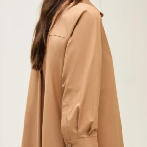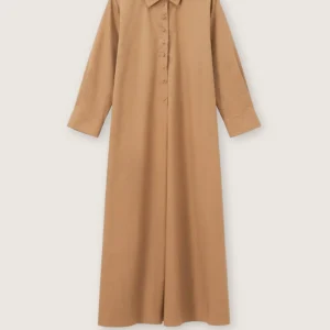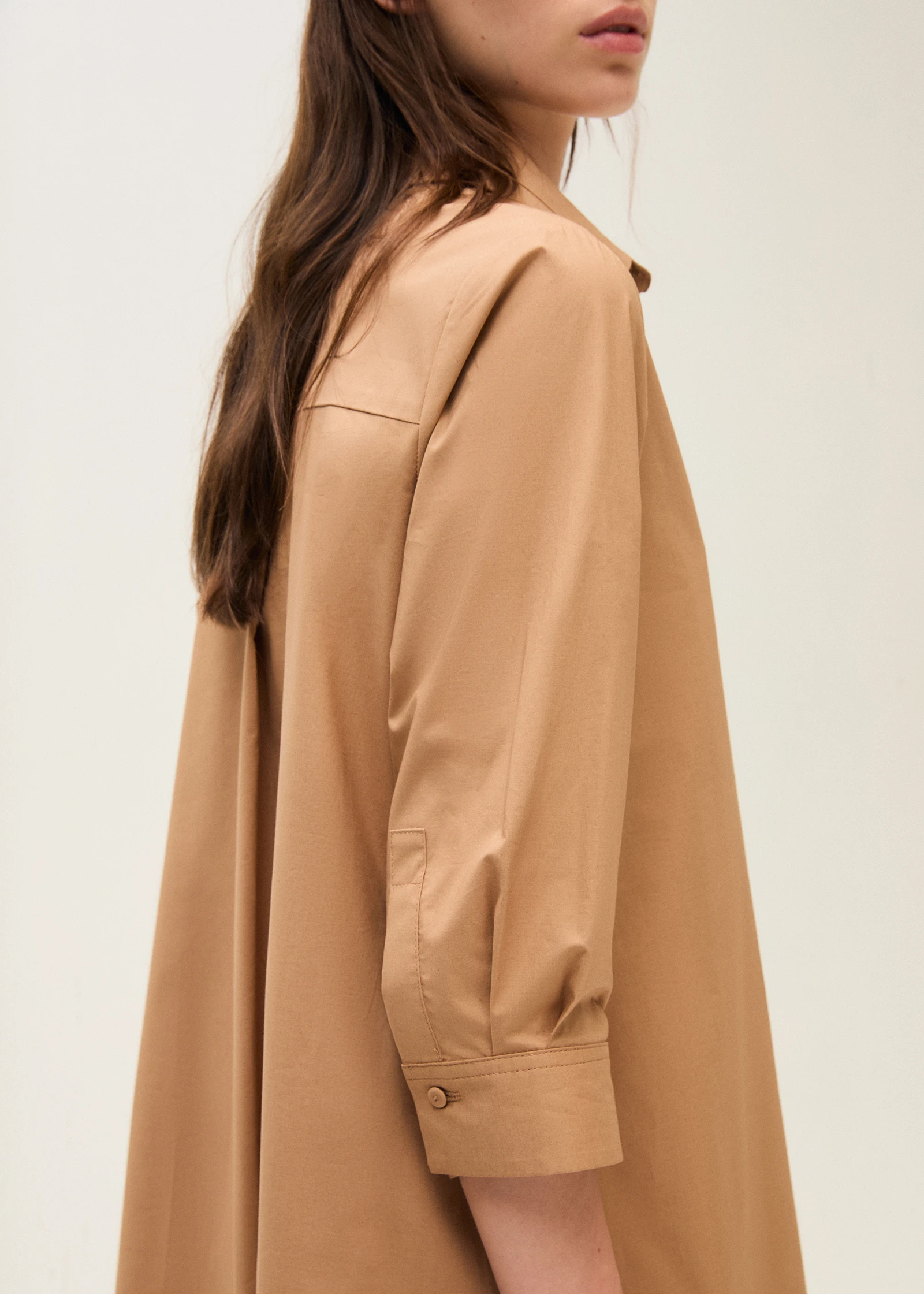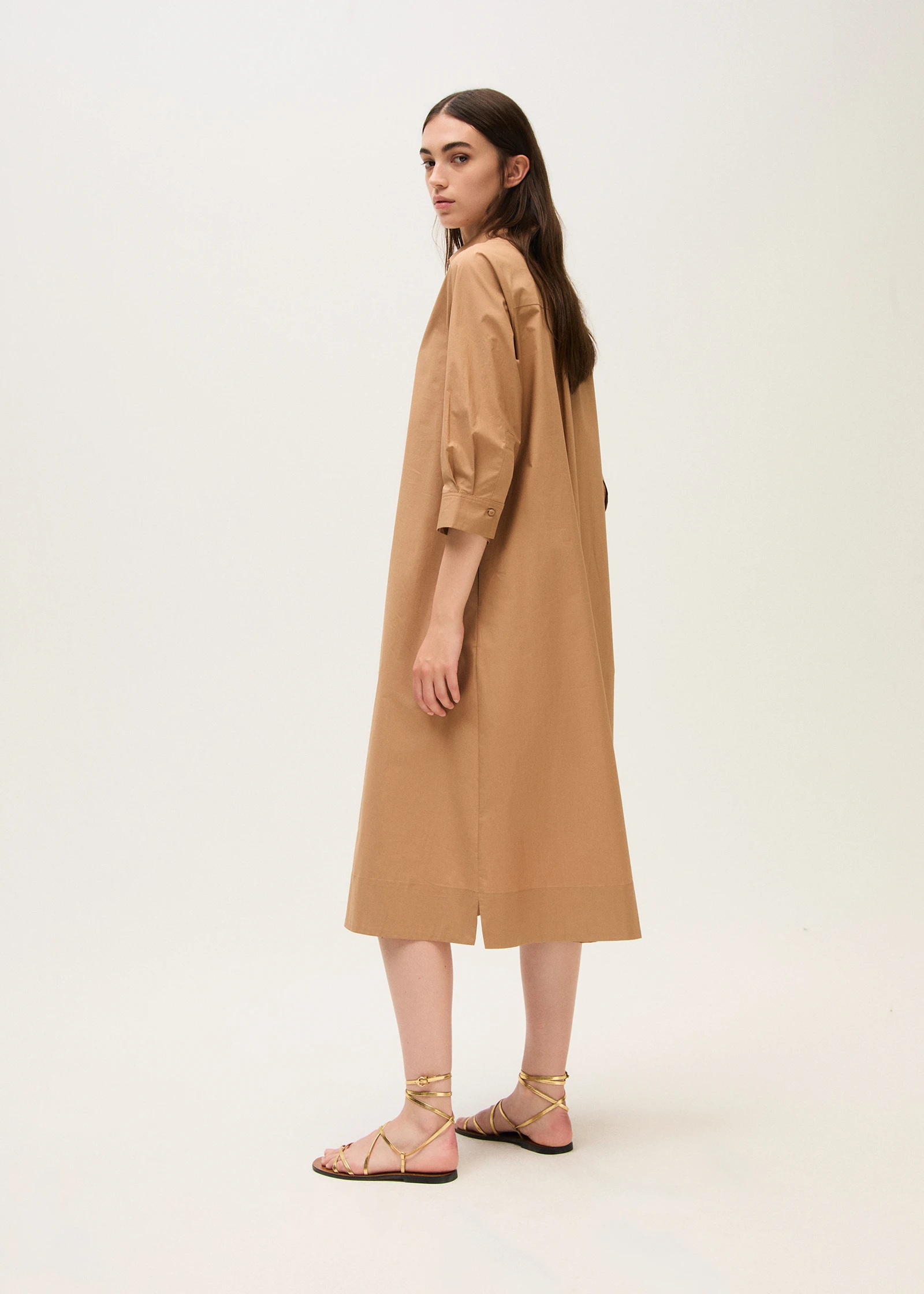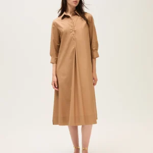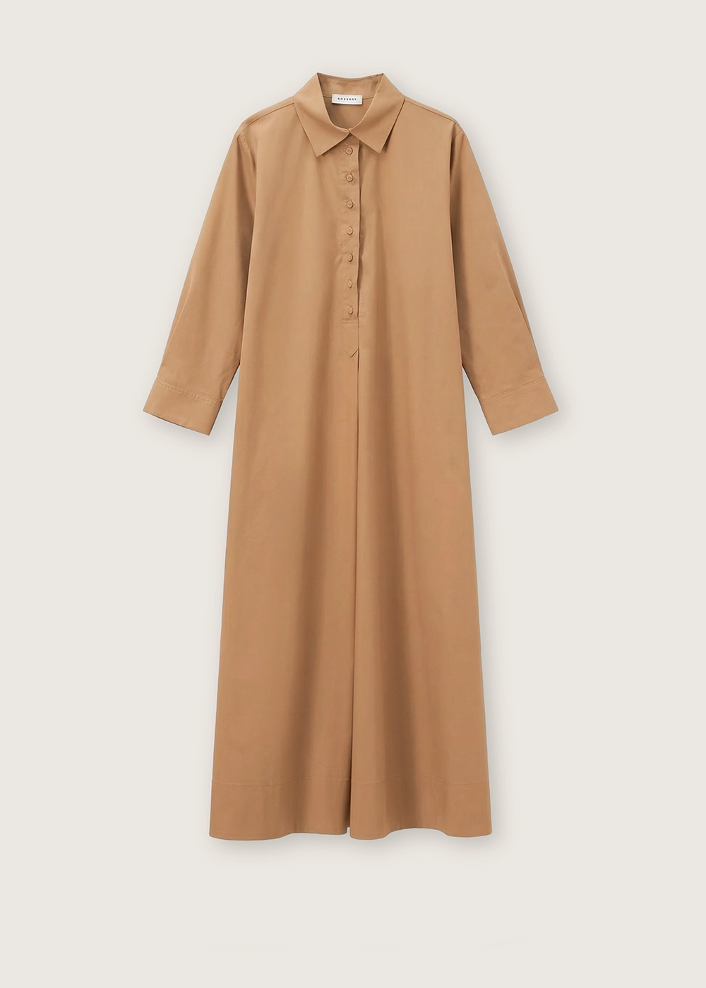 Langes Polo-Kleid aus Baumwoll-Popeline mit ausgestellter, legerer Linienführung. Es verfügt über einen klassischen Kragen, eine Polo-Knopfleiste und dreiviertellange Ärmel mit kleinem Bündchen. Eine mittige Falte vorne verleiht der Silhouette Dynamik. Ein essentieller und vielseitiger Schnitt, ideal für eine tägliche, ungezwungene Eleganz.