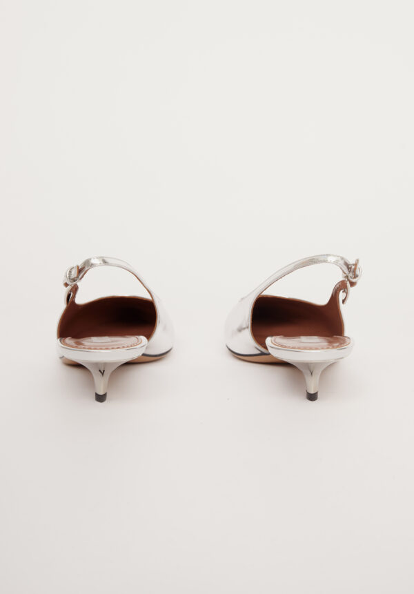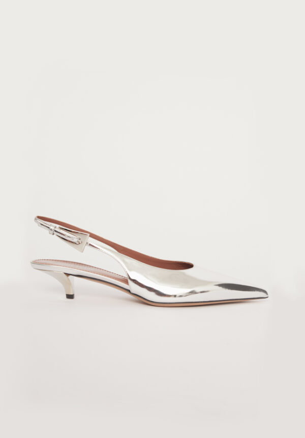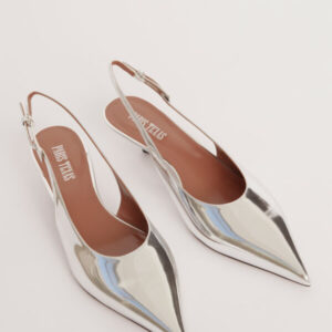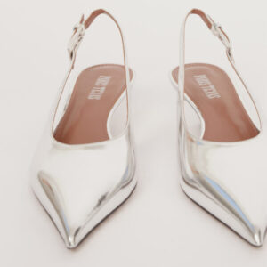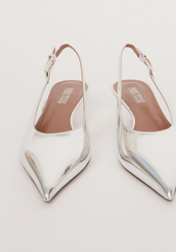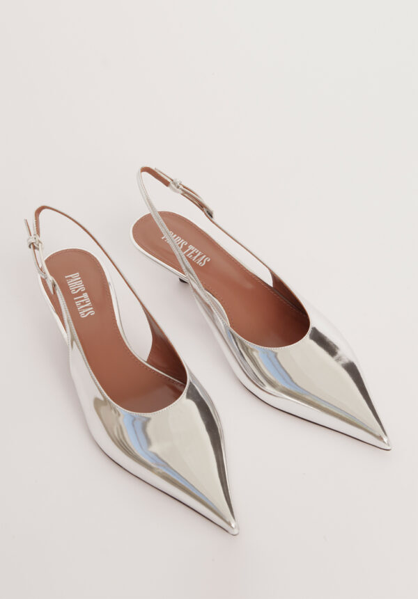 Diese exquisiten Slingback-Pumps „Jessica“ von PARIS TEXAS vereinen raffinierten Minimalismus mit modernem Glamour. Gefertigt aus glänzendem, silberfarbenem Leder mit Spiegeleffekt, fangen sie bei jedem Schritt das Licht ein und reflektieren es – ein fast flüssigmetallisches Finish, das futuristisch und zeitlos elegant zugleich wirkt. Die spitz zulaufende Form streckt den Fuß optisch, während die klassische Slingback-Silhouette eine perfekte Balance aus Sicherheit und Verführung bietet. Der bezogene Kitten-Heel sorgt für die ideale Absatzhöhe – elegant genug für den Abend und gleichzeitig bequem genug für den ganzen Tag. So sind diese Pumps ebenso praktisch wie auffällig.
