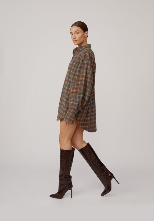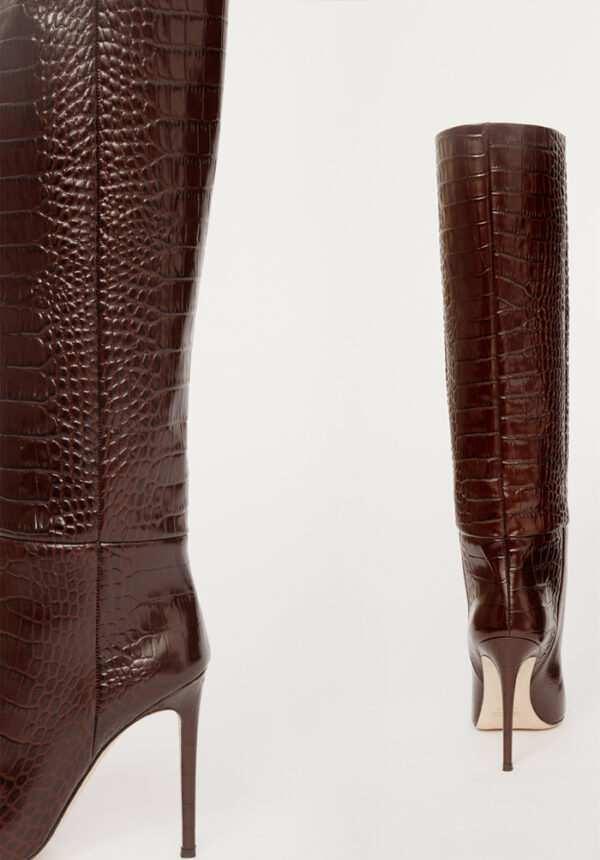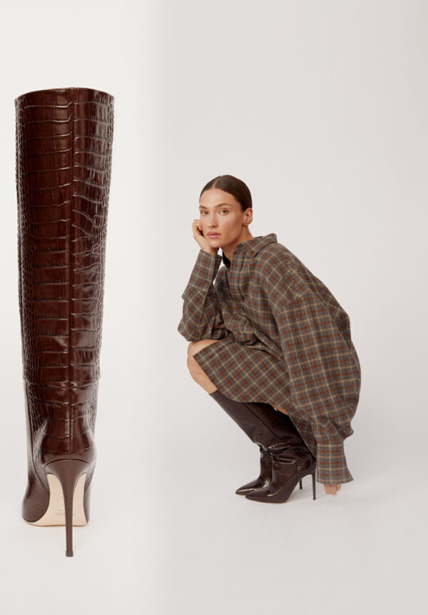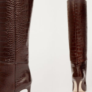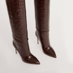 Die markanten „Stiletto“-Stiefel von PARIS TEXAS definieren modernes Power-Dressing neu – mit ihrer souveränen Präsenz und luxuriösen Verarbeitung. Gefertigt aus edlem, schokoladenbraunem Leder mit geprägter Krokodiloptik, besticht die Oberfläche durch eine luxuriöse Textur und strahlt gleichzeitig raffinierte Eleganz aus. Der tonnenförmige Schaft mit seinen klaren, architektonischen Linien schmiegt sich schmeichelhaft an das Bein und formt eine schlanke Silhouette, die die Figur optisch streckt und betont. Diese zeitgenössische Interpretation des klassischen Stiefels wirkt zeitlos und gleichzeitig absolut topaktuell. Jeder Schritt wird zum Ausdruck von Selbstbewusstsein und raffiniertem Stil.