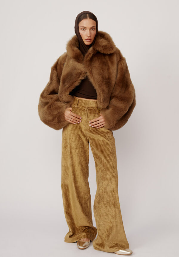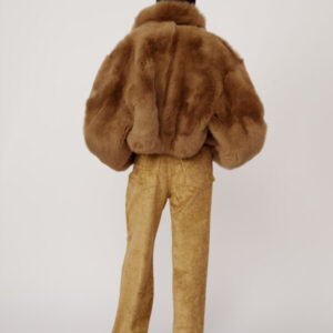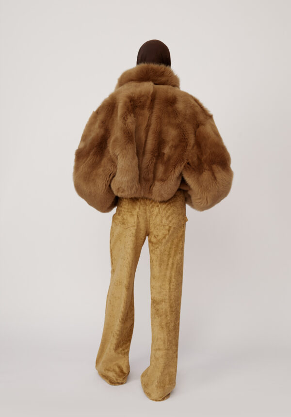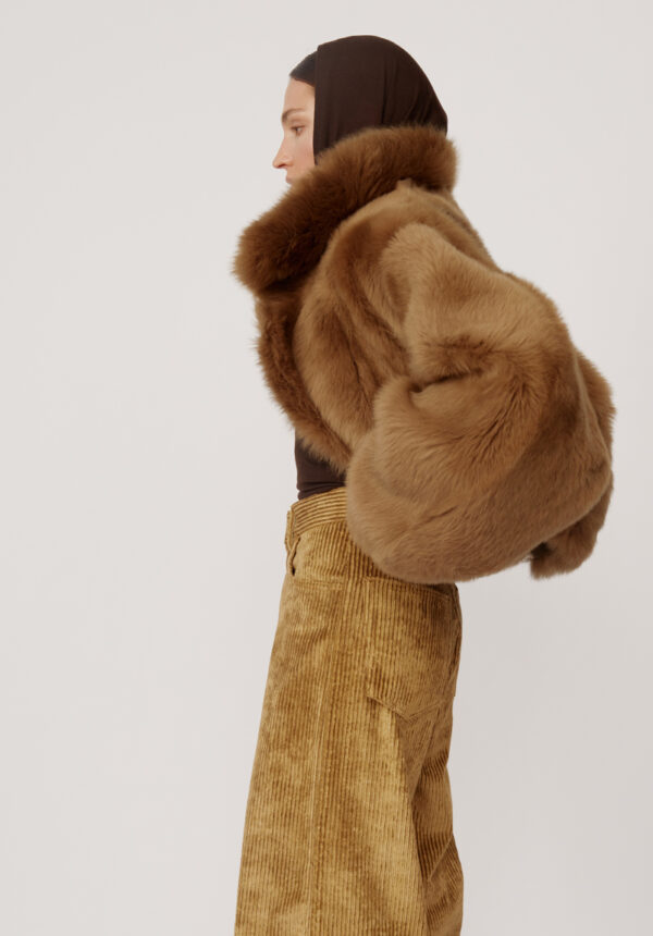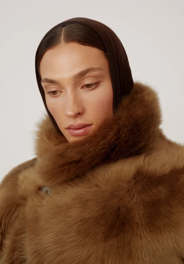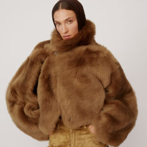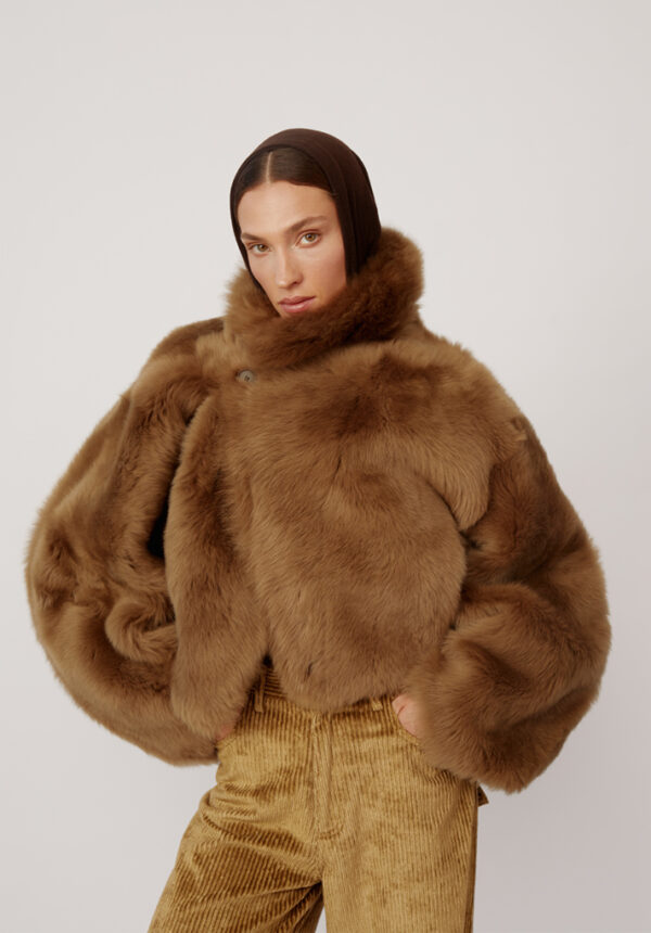 Die kurze Shearling-Jacke „Nebula“ von PETAR PETROV, gefertigt aus luxuriösem 100% Lammleder, verkörpert mühelosen Luxus mit einem Hauch Extravaganz. Der satte Khaki-Grünton bietet eine elegante Alternative zu klassischen Neutraltönen, während die weiche Langhaarstruktur für beeindruckende optische Tiefe und haptische Reize sorgt. Der bewusst oversized geschnittene Look umspielt Schultern und Oberkörper und erzeugt eine kokonartige Form, die sowohl schützend als auch modisch wirkt. Der markante Stehkragen setzt ein ausdrucksstarkes Detail, rahmt das Gesicht ein und bietet vielseitige Styling-Optionen – hochgestellt für maximale Wirkung oder umgeschlagen für einen lässigeren Look.
