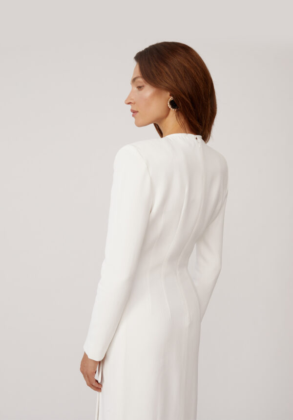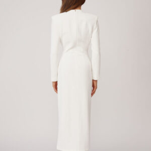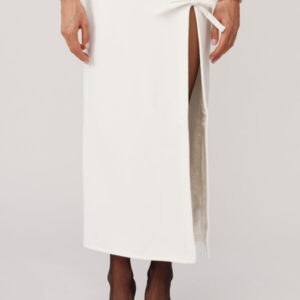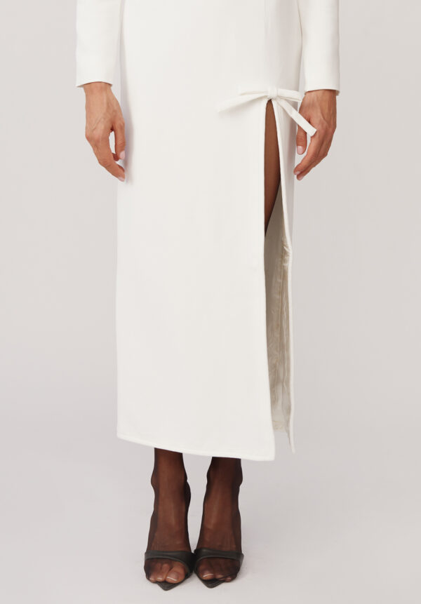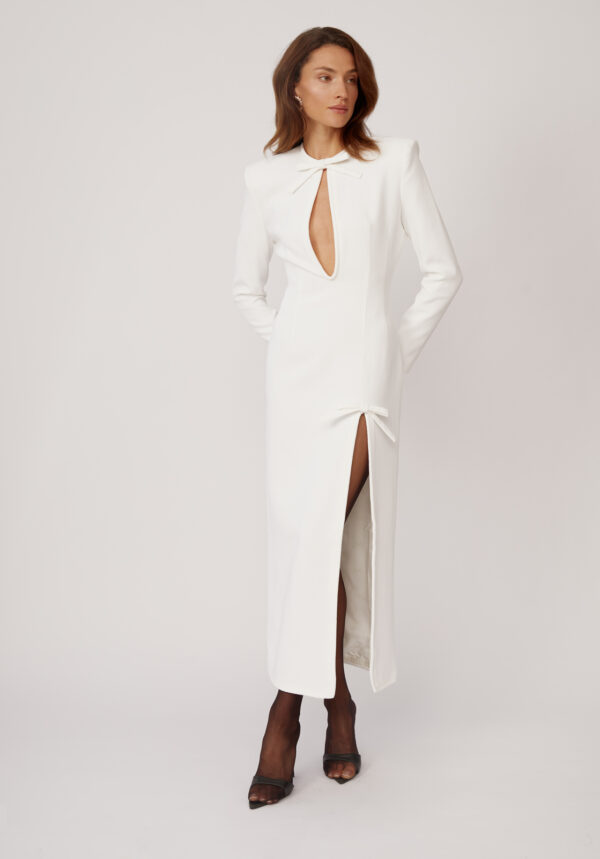 Ein weißes Maxikleid von ROWEN ROSE, das minimalistische Eleganz und architektonische Präzision ausstrahlt. Die schlanke Silhouette wird durch die markanten Schultern betont und verleiht dem Kleid einen Hauch moderner Eleganz. Ein geometrischer Ausschnitt und ein gewagter Schlitz vorne geben genau die richtige Menge Haut preis und schaffen so ein harmonisches Gleichgewicht zwischen Reinheit und Sinnlichkeit. Die schokoladenbraunen Schleifen zieren das Kleid. Dieses Kleid verkörpert raffinierte Schlichtheit mit einem kühnen Twist und ist perfekt für besondere Anlässe und Abende, die nach atemberaubender Eleganz verlangen.
