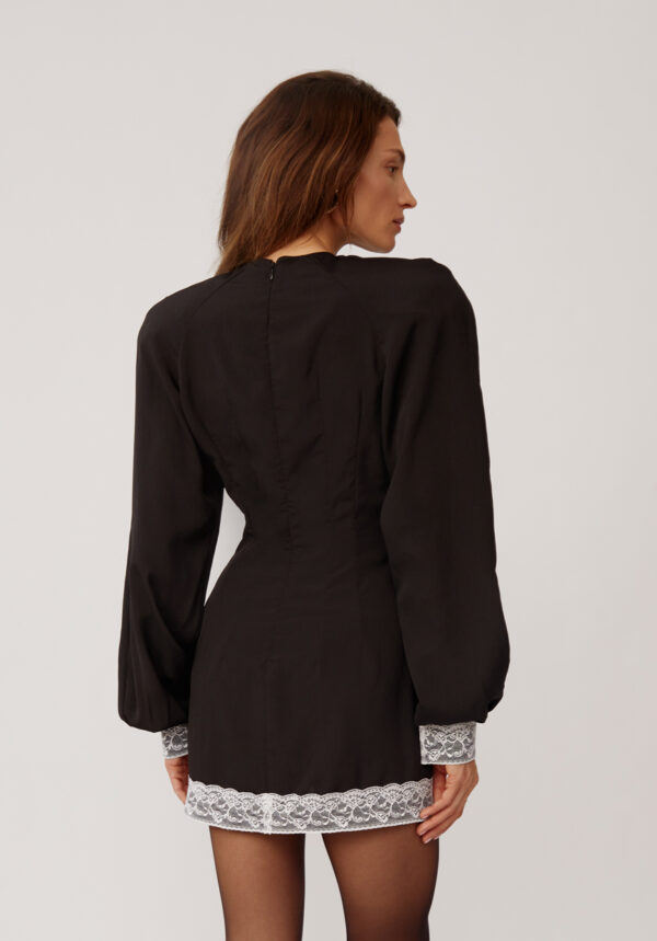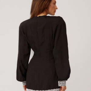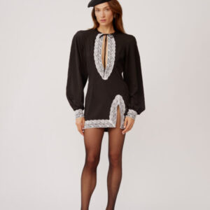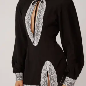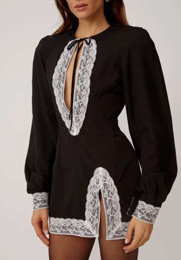 Dieses schwarze Minikleid von ROWEN ROSE vereint Eleganz mit kühner Verführungskraft. Voluminöse Ärmel und strukturierte Manschetten prägen die Silhouette, während der tiefe Ausschnitt mit Bindedetail und der vordere Schlitz einen Hauch sinnlicher Modernität verleihen. Kontrastierende weiße Spitzenborte verleiht dem Look romantischen Charme und lässt den markanten schwarzen Stoff leichter wirken. Die perfekte Balance aus klassischer Raffinesse und gewagter Frische macht dieses Kleid zum idealen Begleiter für festliche Abendveranstaltungen.