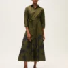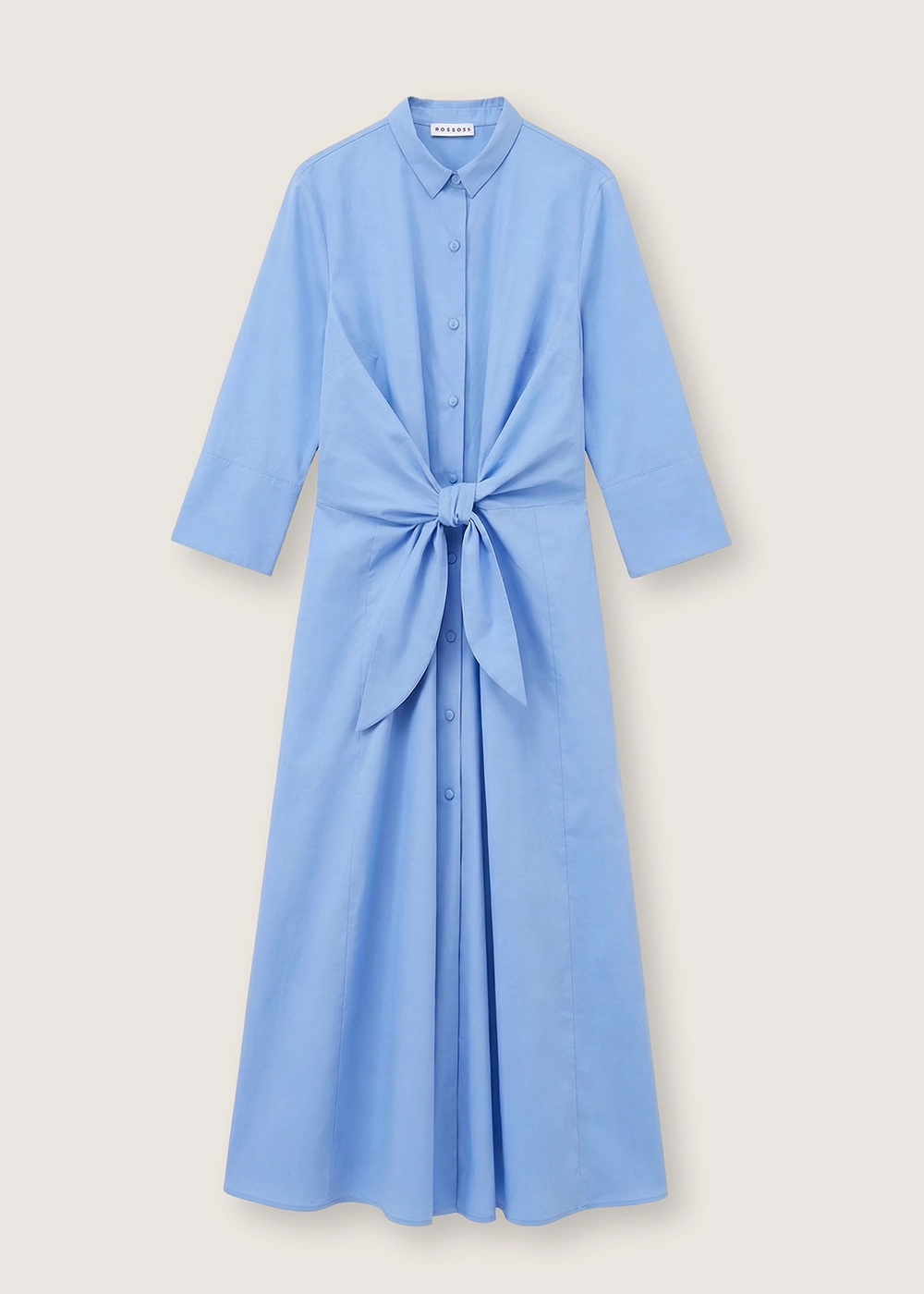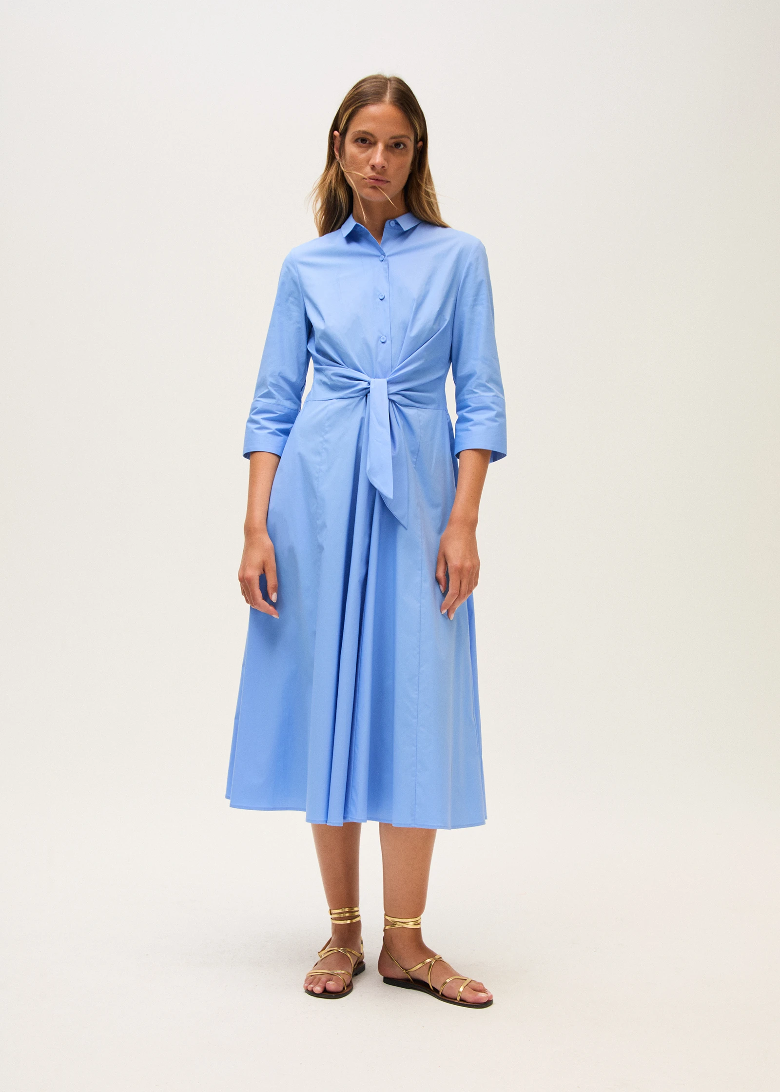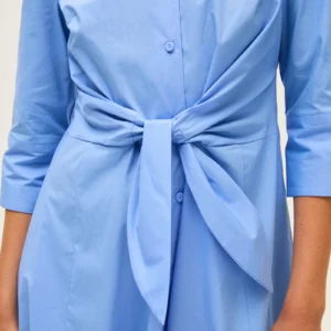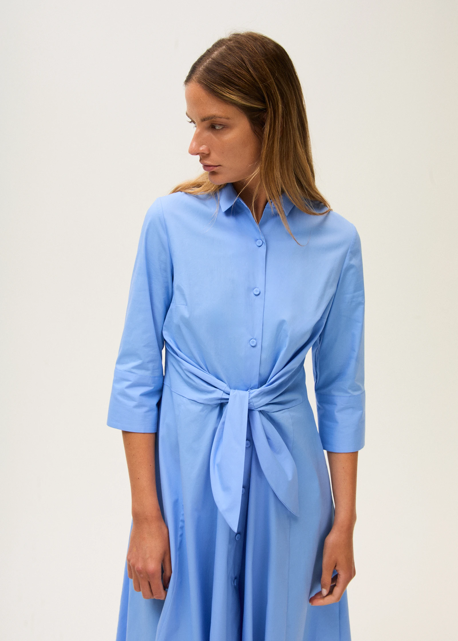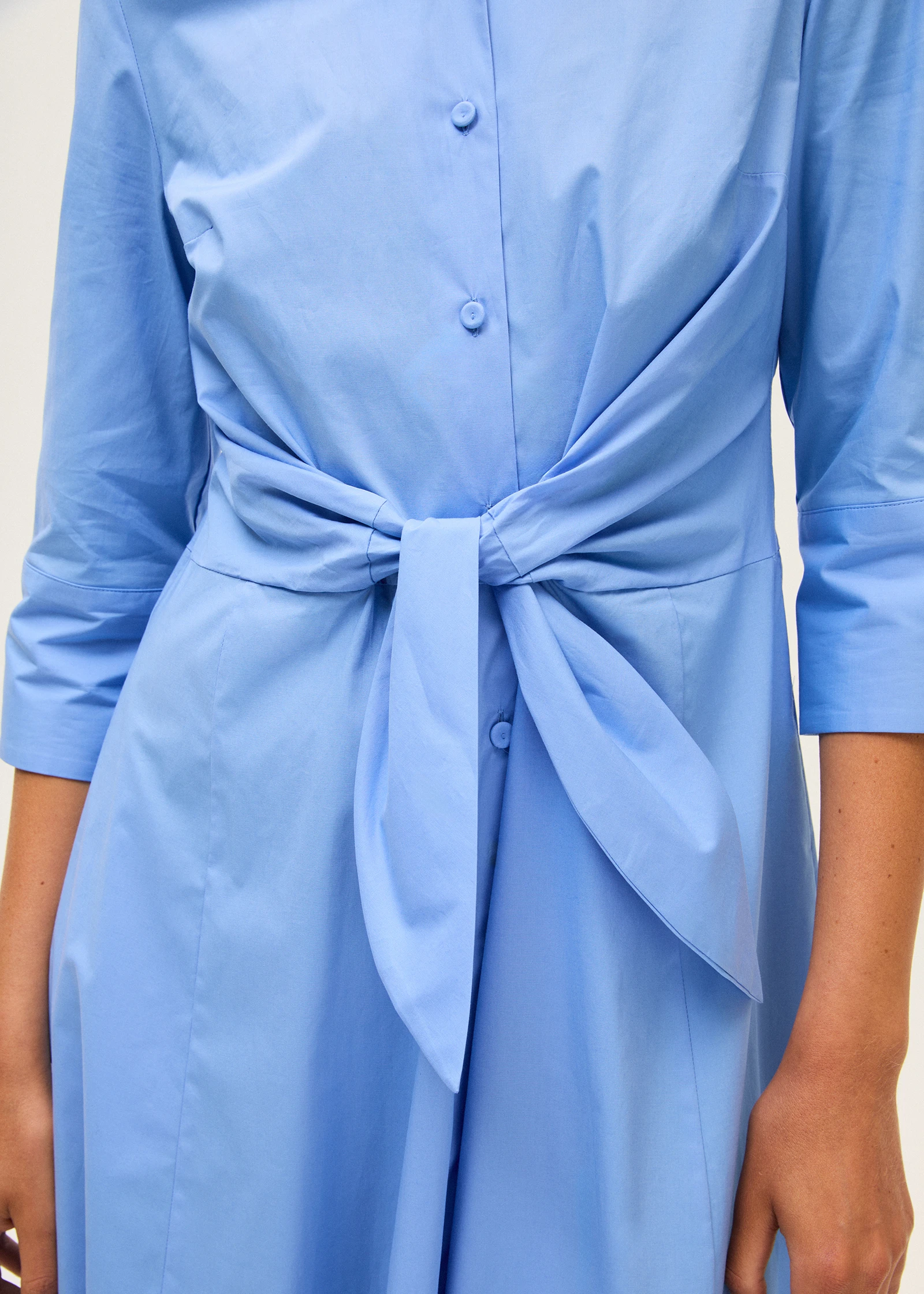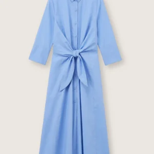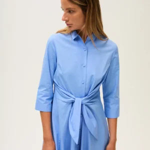 Hemdkleid aus Baumwoll-Popeline mit ausgestellter, fließender Silhouette. Es verfügt über einen klassischen Kragen, dreiviertellange Ärmel und eine durchgehende Knopfleiste vorne. Der Knoten in der Taille betont die Figur mit einem femininen, zeitgemäßen Akzent. Ein vielseitiges und elegantes Modell, ideal für einen zurückhaltenden, dennoch anspruchsvollen Stil.