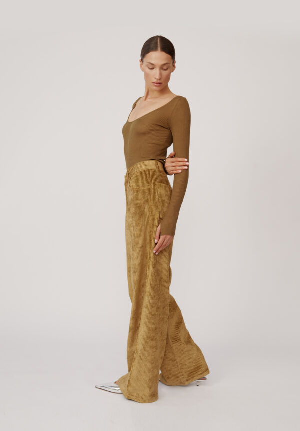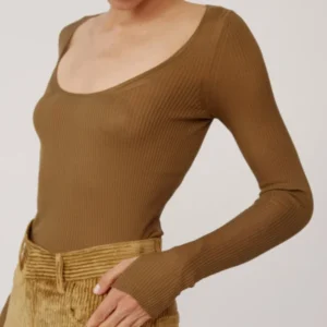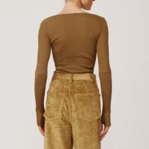 Das „Muse“-Top von PETAR PETROV ist aus feinster Seidengarne gefertigt, und sein federleichter Rippstrick vermittelt ein fließendes, wie eine zweite Haut anmutendes Tragegefühl. Ein tiefer, abgerundeter Ausschnitt rahmt das Dekolleté mit raffinierter Leichtigkeit, während die schmale Silhouette und die langen, eng anliegenden Ärmel – vollendet mit dezenten Daumenöffnungen – eine elegante, feminine Linie formen. Vollständig in Form gestrickt und mit höchster Präzision gearbeitet, vereint es Zartheit mit modernem Esprit. Tragen Sie es zu den Cordhosen „Harbor“ von PETAR PETROV.