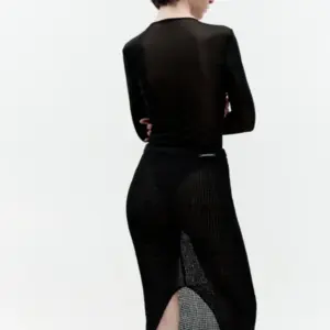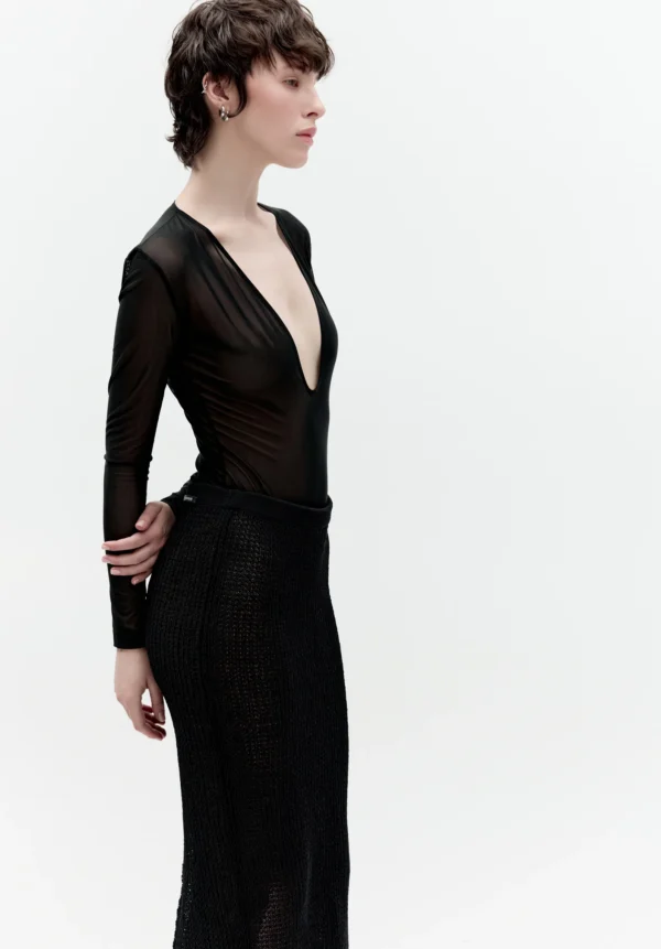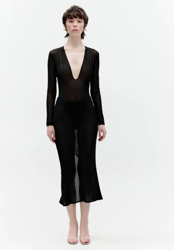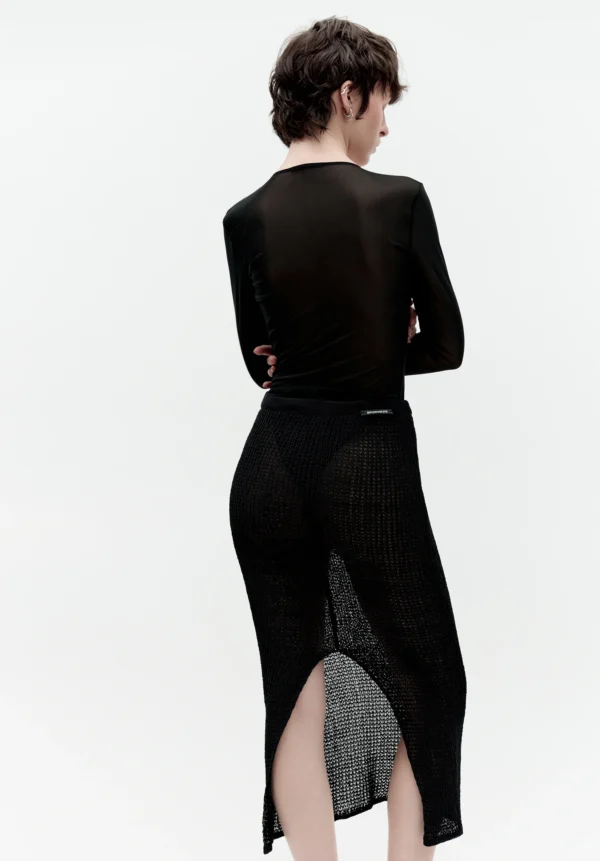 Der schwarze gestrickte Midirock von BOYAROVSKAYA vereint auf subtile Weise handwerkliche Kunstfertigkeit mit moderner Leichtigkeit. Aus feinem Baumwollgarn in offener Stricktechnik gefertigt, entsteht ein halbtransparenter Effekt, der der Silhouette Frische und raffinierte Sinnlichkeit verleiht. Seine sanft fließende Form bewegt sich wunderschön, und die transparente Struktur lädt zu kreativem Layering ein.