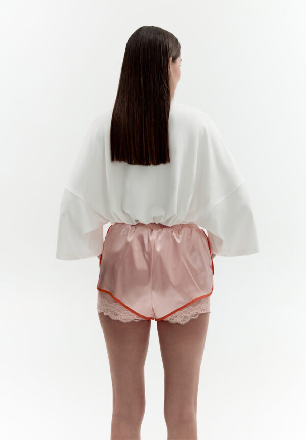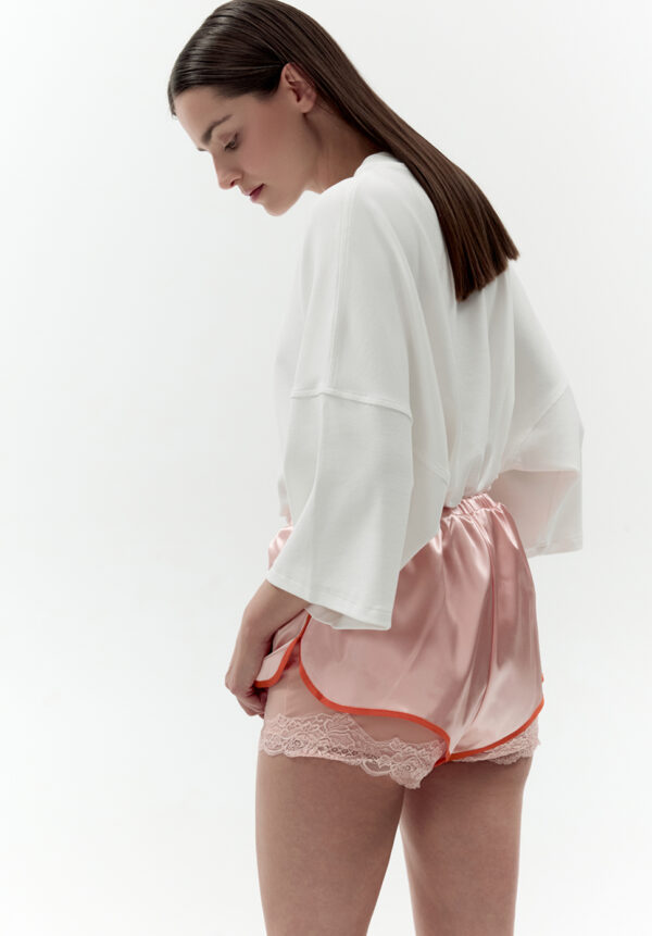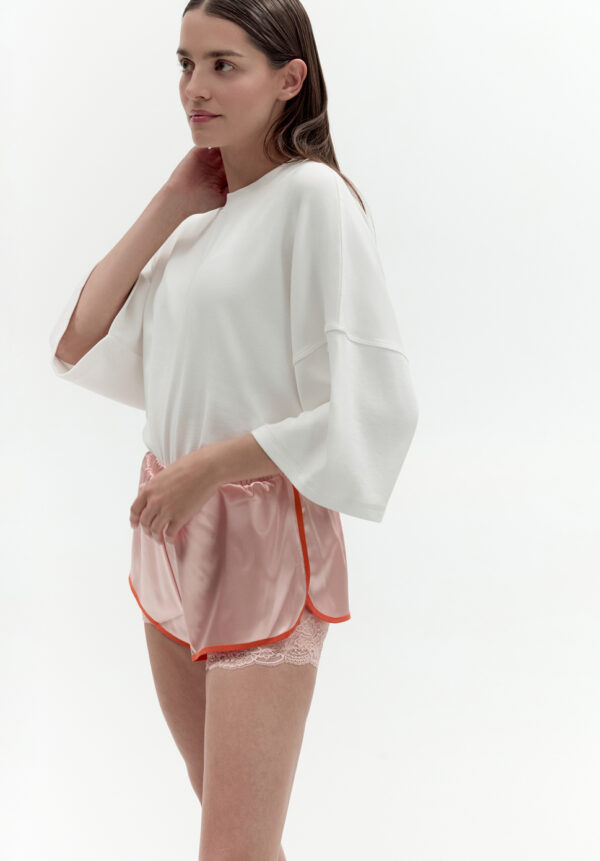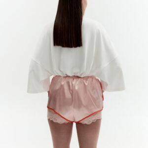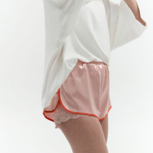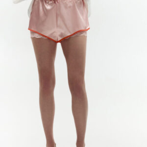 Diese pfirsichfarbenen Shorts aus seidig-weichem Satin von VAILLANT verkörpern raffinierten Glamour mit einem Hauch von Sinnlichkeit. Ihr eleganter Schimmer reflektiert das Licht sanft und erzeugt so eine fließende Eleganz, während die orangefarbenen Details einen stilvollen Akzent setzen. Besonders hervorzuheben ist der kunstvoll gearbeitete Spitzenbesatz am Saum, der bei jeder Bewegung sanft hervortritt und der Silhouette Leichtigkeit und Finesse verleiht. Es ist eine subtile Balance zwischen Pariser Eleganz und moderner Romantik.